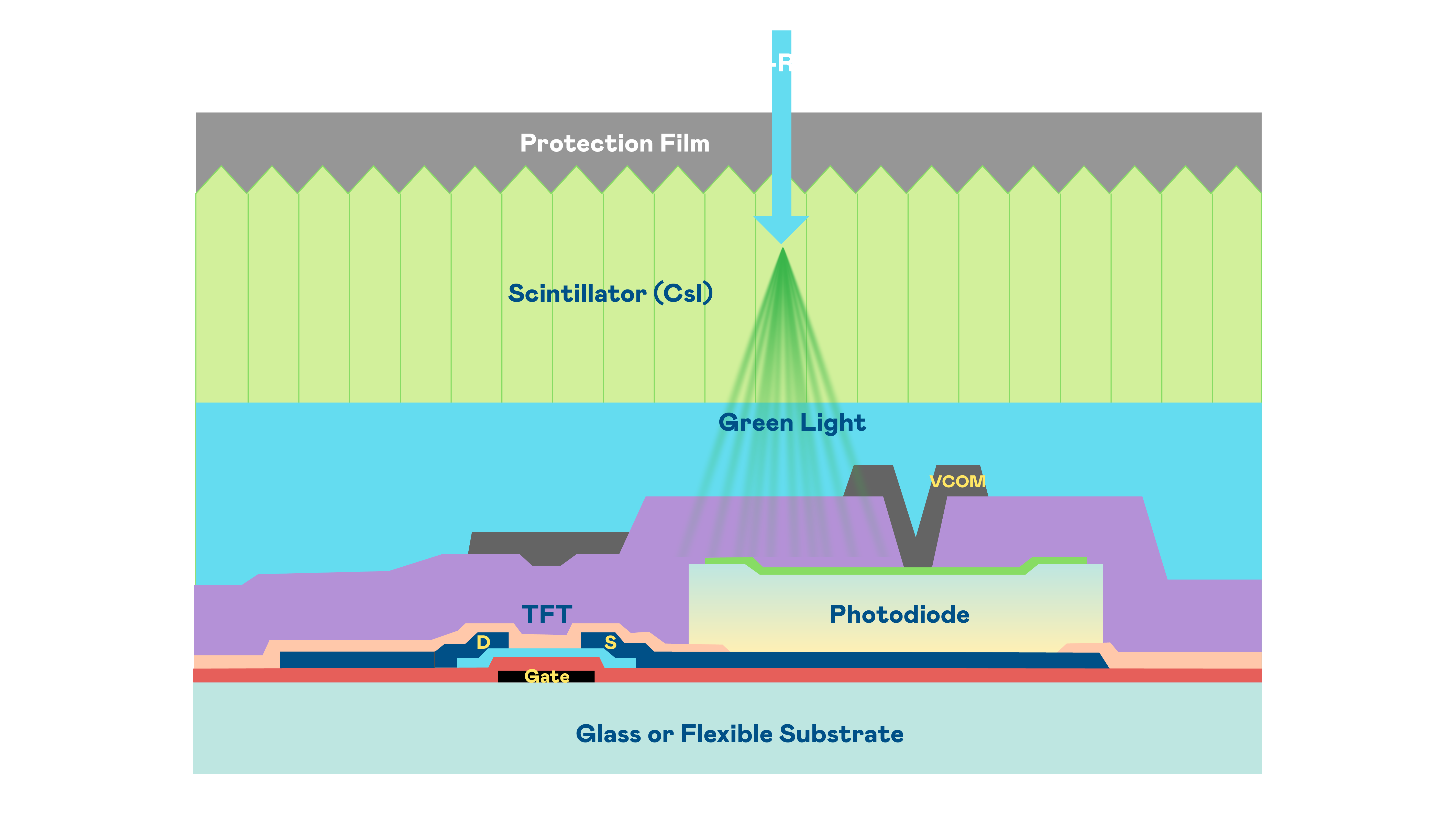 梦之城的X光影像感测阵列使用薄膜电晶体 (TFT) 作为每个像素的读取开关,搭配光电二极体(Photodiode)的光电转换元件,用以感测X光影像讯号。